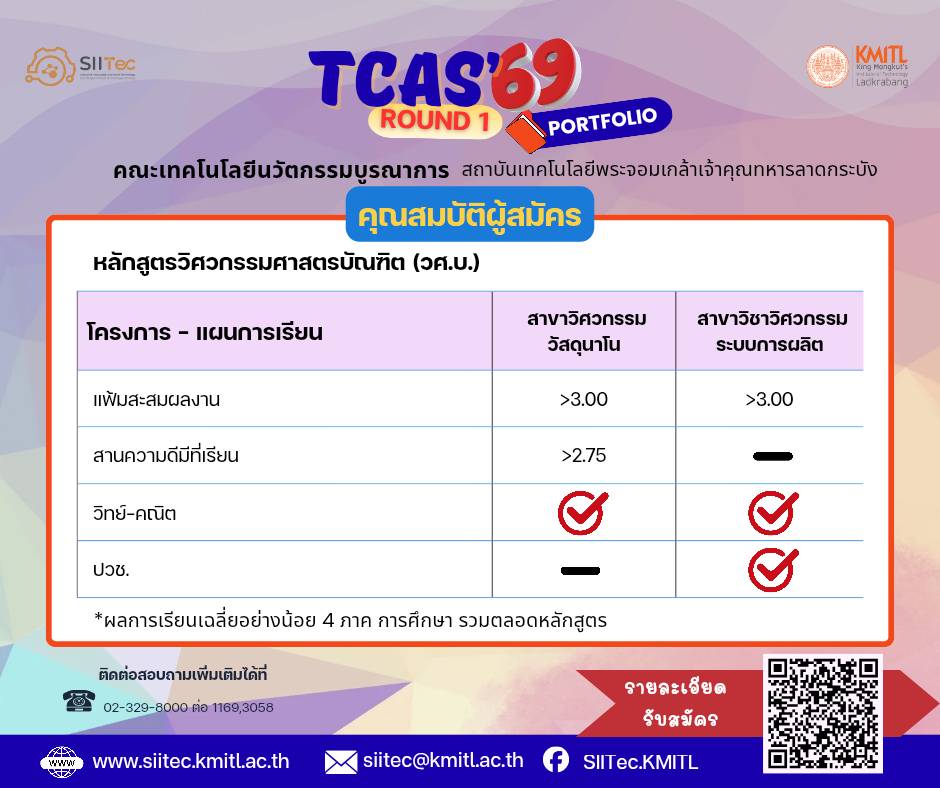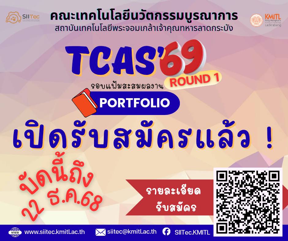 คณะเทคโนโลยีนวัตกรรมบูรณาการ (School of Integrated Innovation and Technology - SIITec) สถาบันเทคโนโลยีพระจอมเกล้าเจ้าคุณทหารลาดกระบัง (สจล.) ประกาศเปิดรับสมัครนักศึกษาใหม่ ระดับปริญญาตรี ประจำปีการศึกษา 2569 ใน รอบ Portfolio (รอบ 1) โครงการรับด้วยแฟ้มสะสมผลงานและโครงการสานความดีมีที่เรียน เพื่อเฟ้นหานักเรียนที่มีความสามารถและศักยภาพ มาร่วมเป็นส่วนหนึ่งของการสร้างสรรค์นวัตกรรมและเทคโนโลยีแห่งอนาคต