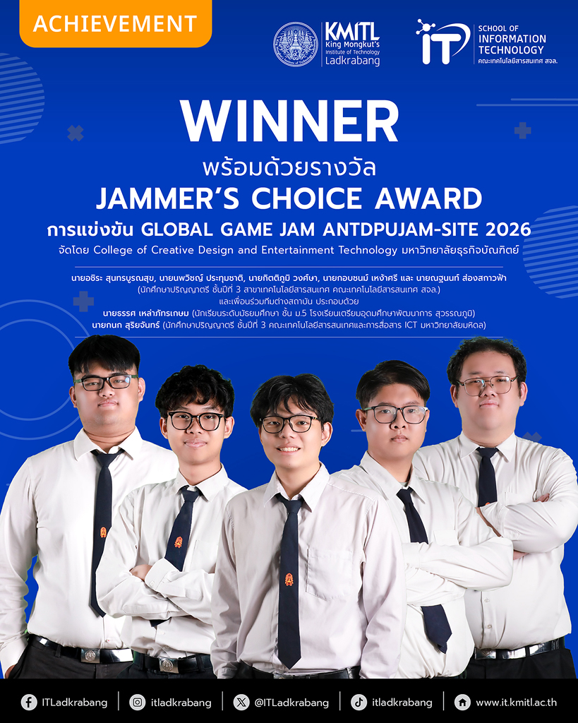 ขอแสดงความยินดีกับทีมนักศึกษาระดับปริญญาตรี คณะเทคโนโลยีสารสนเทศ สถาบันเทคโนโลยีพระจอมเกล้าเจ้าคุณทหารลาดกระบัง (สจล.) ในการคว้า 3 รางวัล จากเวทีการแข่งขัน GLOBAL GAME JAM ANTDPUJAM-SITE 2026 ซึ่งจัดโดย College of Creative Design and Entertainment Technology University มหาวิทยาลัยธุรกิจบัณฑิตย์ (DPU) ระหว่างวันที่ 30 มกราคม – 1 กุมภาพันธ์ พ.ศ. 2569 ที่ผ่านมา