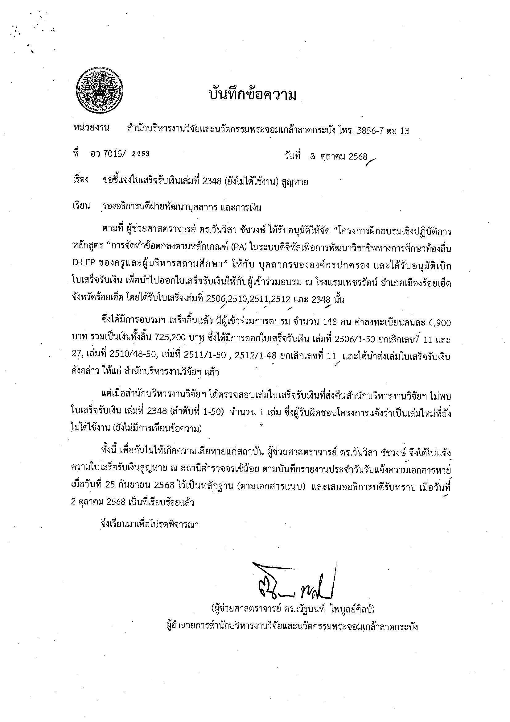 สถาบันเทคโนโลยีพระจอมเกล้าเจ้าคุณทหารลาดกระบัง ขอแจ้งยกเลิกใบเสร็จ เล่มที่ 2348 (ลำดับที่ 1 - 50 ) รายละเอียดตามเอกสารแนบ File attachment Document ยกเลิกใบเสร็จ.pdf News 3 views วันที่ Wed, 04/01/2026 - 11:23 จำนวนผู้เข้าชม 3 views Gallery Share this page