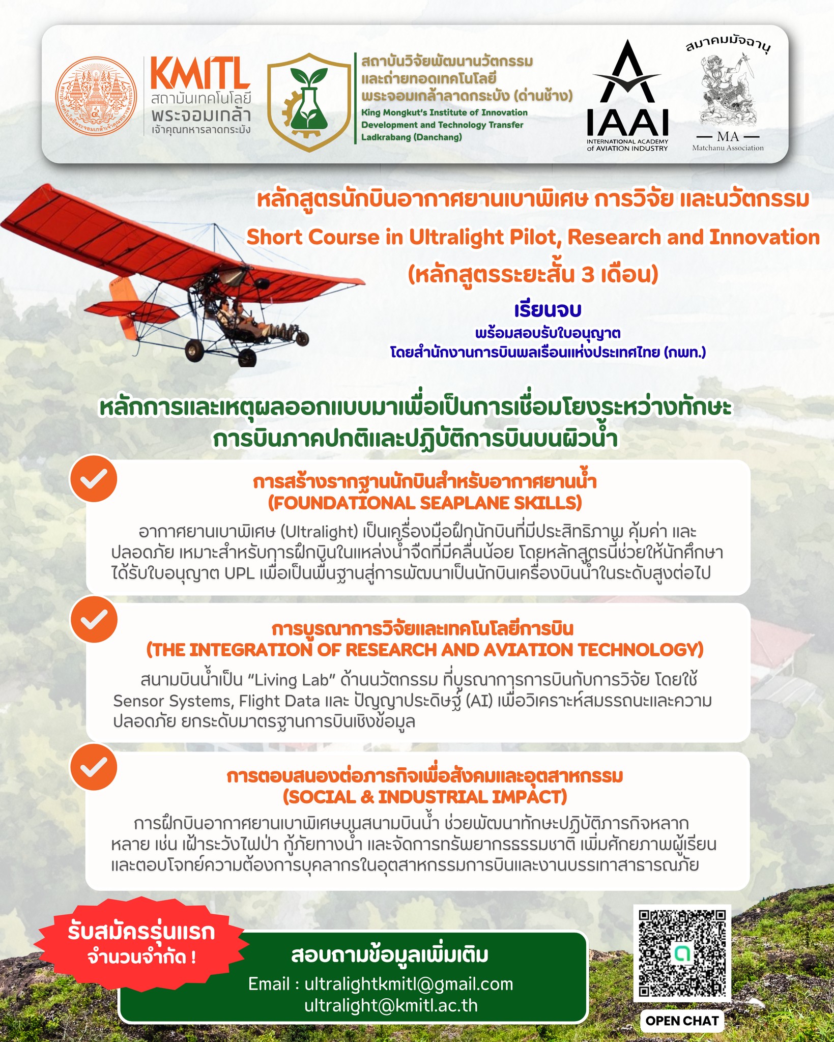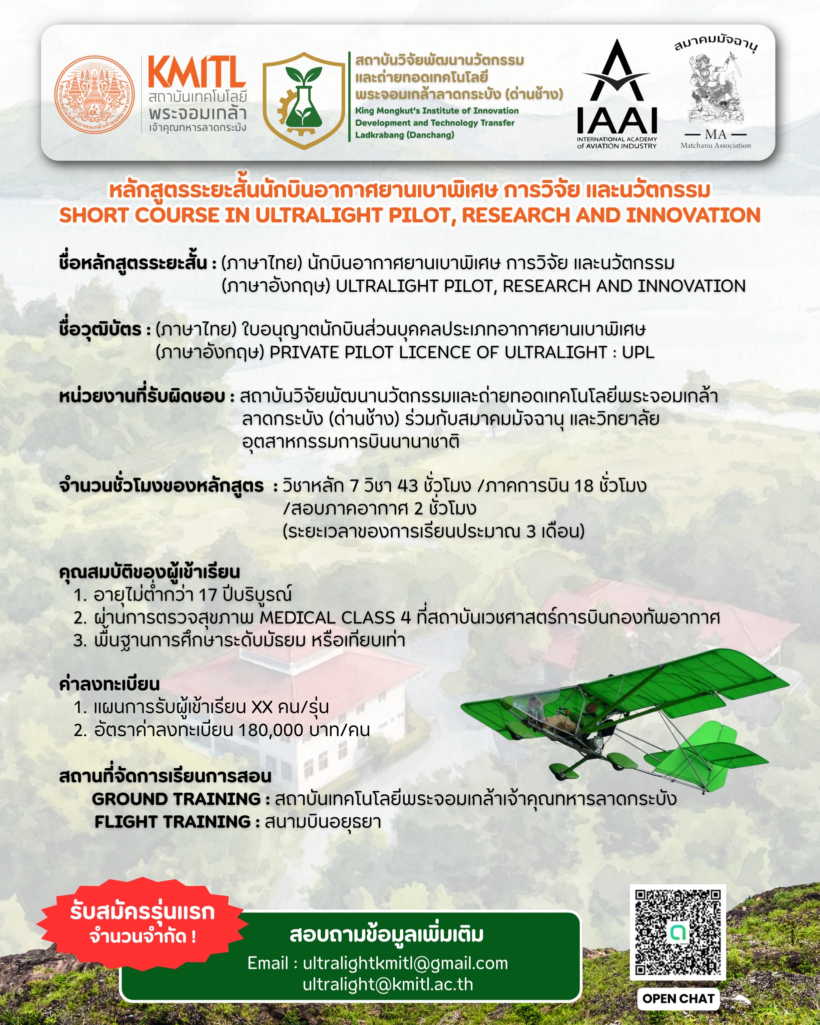 ผู้สนใจสามารถติดตามรายละเอียดเพิ่มเติมได้ทาง Facebook: ultralightkmitl หรือสอบถามผ่านอีเมล ultralightkmitl@gmail.com และ ultralight@kmitl.ac.th