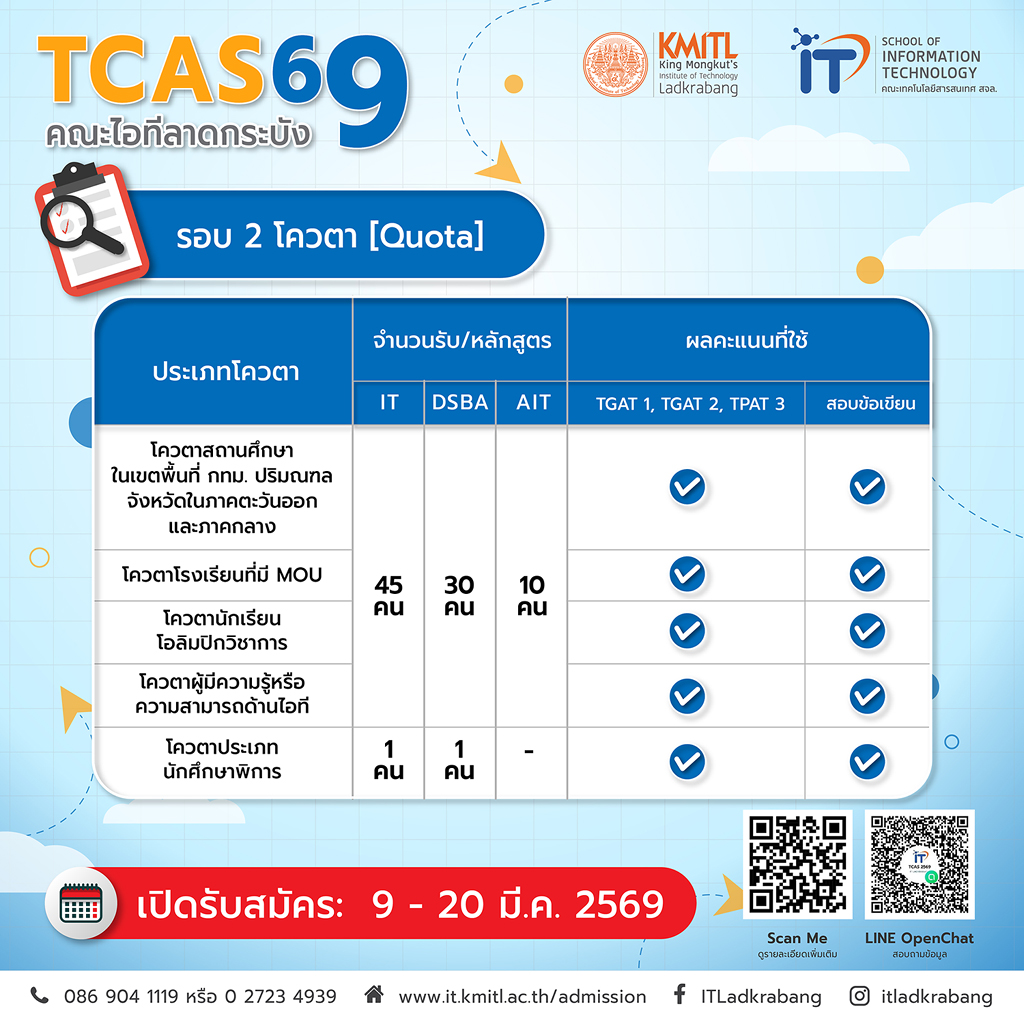 TCAS69 รอบ 2 (โควตา) คณะไอทีลาดกระบัง เปิดรับสมัครแล้ว!