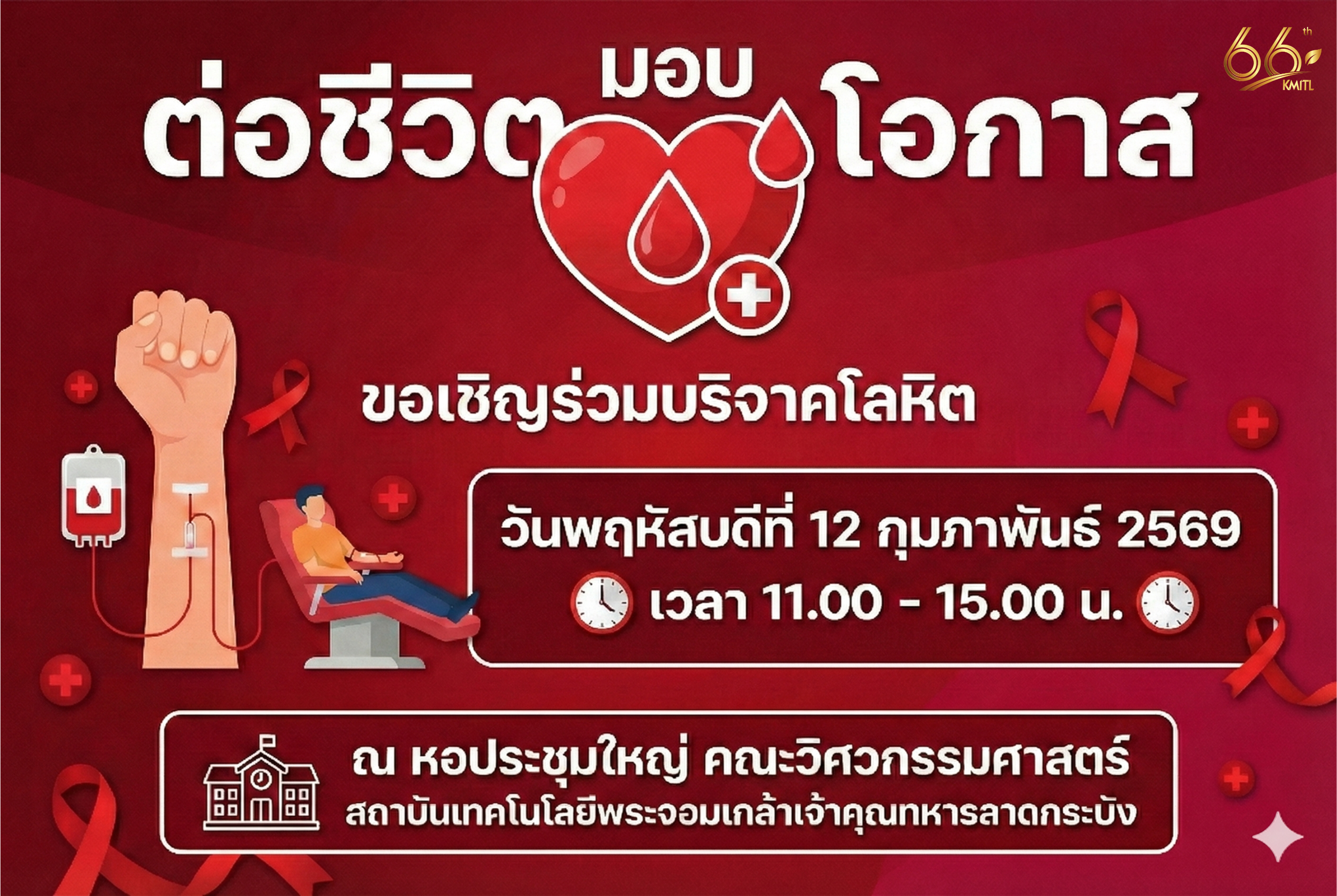 สถาบันเทคโนโลยีพระจอมเกล้าเจ้าคุณทหารลาดกระบัง ร่วมกับสภากาชาดไทย ขอเชิญทุกท่านร่วมบริจาคโลหิต "ต่อชีวิตมอบโอกาส" ในวันพฤหัสบดีที่ 12 กุมภาพันธ์ 2569 เวลา 11.00 - 15.00 น. ณ หอประชุมใหญ่ คณะวิศวกรรมศาสตร์ สถาบันเทคโนโลยีพระจอมเกล้าเจ้าคุณทหารลาดกระบัง