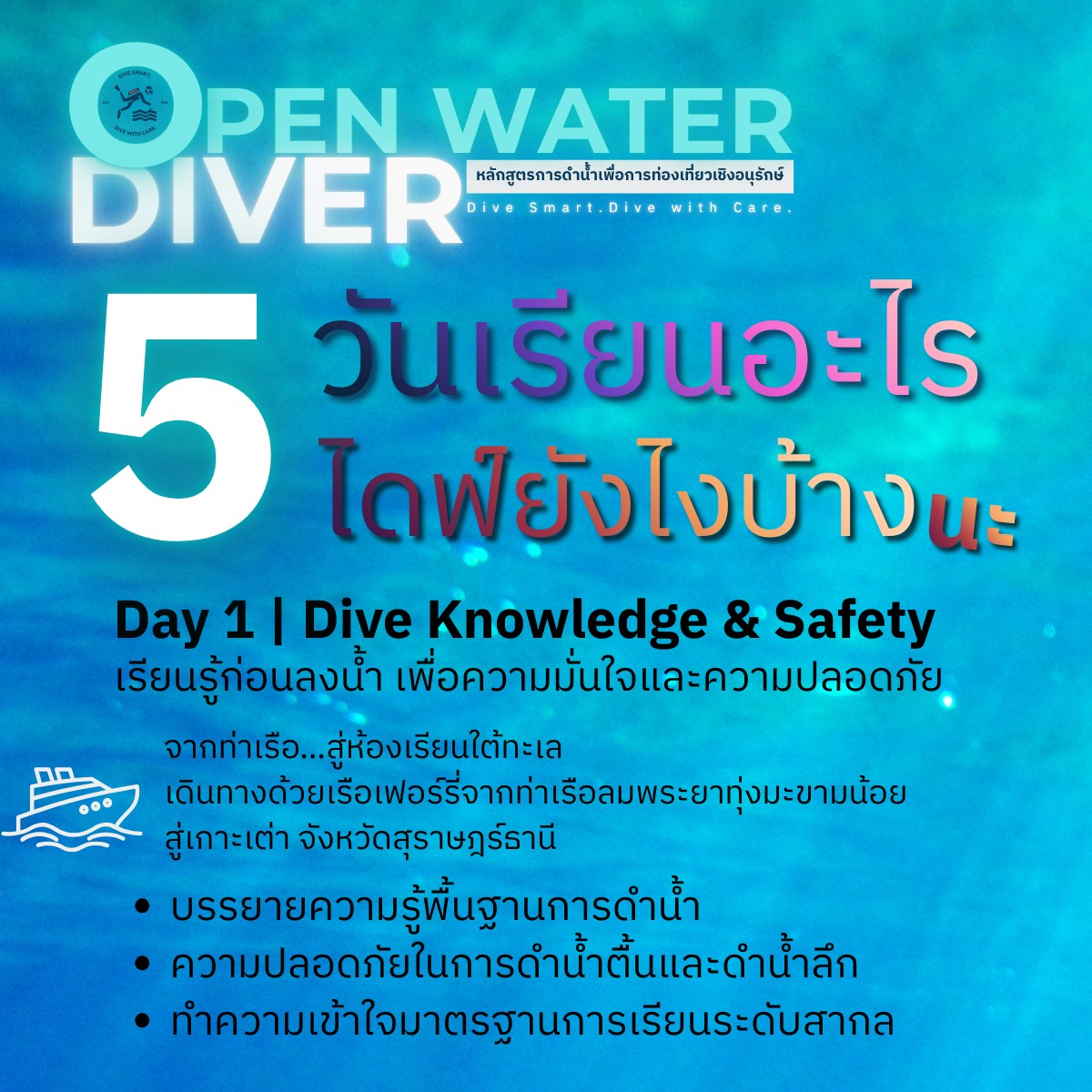 เปิดจัด หลักสูตร Open Water Diver – การดำน้ำเพื่อการท่องเที่ยวเชิงอนุรักษ์ มุ่งยกระดับการดำน้ำให้เป็นมากกว่ากิจกรรมท่องเที่ยว โดยเน้นการเรียนรู้อย่างเป็นระบบตามมาตรฐานสากล ควบคู่การปลูกฝังจิตสำนึกด้านสิ่งแวดล้อมทางทะเล