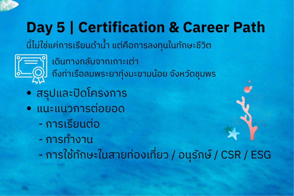 ผู้เข้าร่วมอบรมจะได้รับความรู้พื้นฐานด้านการดำน้ำ การใช้อุปกรณ์อย่างถูกต้อง หลักความปลอดภัยใต้น้ำ ตลอดจนแนวทางการท่องเที่ยวเชิงอนุรักษ์ที่สอดคล้องกับบริบทของระบบนิเวศทางทะเลไทย ซึ่งสามารถต่อยอดสู่การศึกษา การประกอบอาชีพ หรือการทำงานด้านการอนุรักษ์ในอนาคตได้
