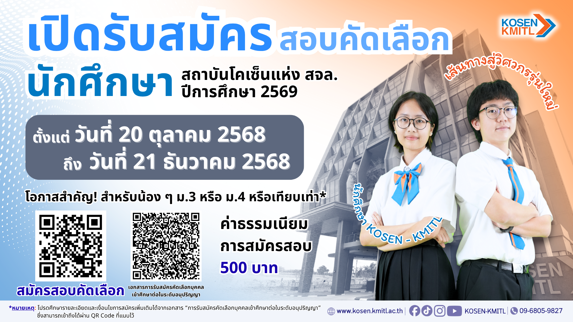สถาบันโคเซ็น แห่งสถาบันเทคโนโลยีพระจอมเกล้าเจ้าคุณทหารลาดกระบัง (KOSEN-KMITL) เปิดรับสมัครนักเรียนที่มีใจรักด้านวิศวกรรม เข้าศึกษาต่อในระดับอนุปริญญา (ต่อเนื่องถึงระดับปริญญาตรี) ปีการศึกษา 2569 โดยเปิดสอนทั้งหมด 3 สาขาวิชา ได้แก่