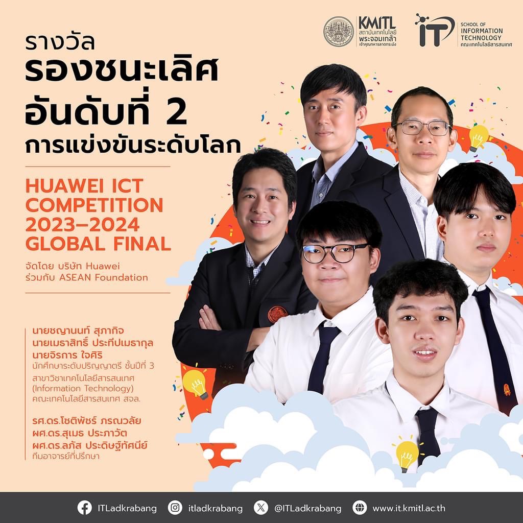ขอแสดงความยินดีกับทีม Bring Your Own Packets สมาชิกทีมประกอบด้วย นายชญานนท์ สุภากิจ, นายเมธาสิทธิ์ ประทีปเมธากุล และ นายจิรการ ใจศิริ นักศึกษาระดับปริญญาตรี ชั้นปีที่ 3 สาขาวิชาเทคโนโลยีสารสนเทศ สถาบันเทคโนโลยีพระจอมเกล้าเจ้าคุณทหารลาดกระบัง คว้ารางวัลรองชนะเลิศอันดับที่ 2 ในสาขา Network มาครอง จากเวทีการแข่งขันระดับโลก ในงาน Huawei ICT Competition 2023–2024 Global Final ที่จัดขึ้นโดย บริษัท Huawei ร่วมกับ ASEAN Foundation เมื่อระหว่างวันที่ 23-26 พฤษภาคม 2567 ที่ผ่านมา ณ Huawei Headquarters เมืองเซินเจิ้น สาธารณรัฐประชาชนจีน ภายใต้การดูแลของอาจารย์ที่ปรึกษาโครงการ 3 ท่าน คือ รองศาสตราจารย์ ดร.โชติพัชร์ ภรณวลัย ผู้ช่วยศาสตราจารย์ ดร.สุเมธ ประภาวัต และ ผู้ช่วยศาสตราจารย์ ดร.ลภัส ประดิษฐ์ทัศนีย์ซึ่งมีทีมที่ฝ่าด่านการแข่งขันมาจากรอบระดับประเทศและรอบระดับภูมิภาคเอเชียแปซิฟิก มาจนถึงรอบสุดท้ายนี้ เป็นจำนวน 160 ทีม จากสถาบันการศึกษาทั่วโลกเป็นจำนวนกว่า 49 ประเทศ