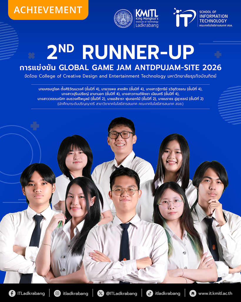 ขอแสดงความยินดีกับทีมนักศึกษาระดับปริญญาตรี คณะเทคโนโลยีสารสนเทศ สถาบันเทคโนโลยีพระจอมเกล้าเจ้าคุณทหารลาดกระบัง (สจล.) ในการคว้า 3 รางวัล จากเวทีการแข่งขัน GLOBAL GAME JAM ANTDPUJAM-SITE 2026 ซึ่งจัดโดย College of Creative Design and Entertainment Technology University มหาวิทยาลัยธุรกิจบัณฑิตย์ (DPU) ระหว่างวันที่ 30 มกราคม – 1 กุมภาพันธ์ พ.ศ. 2569 ที่ผ่านมา