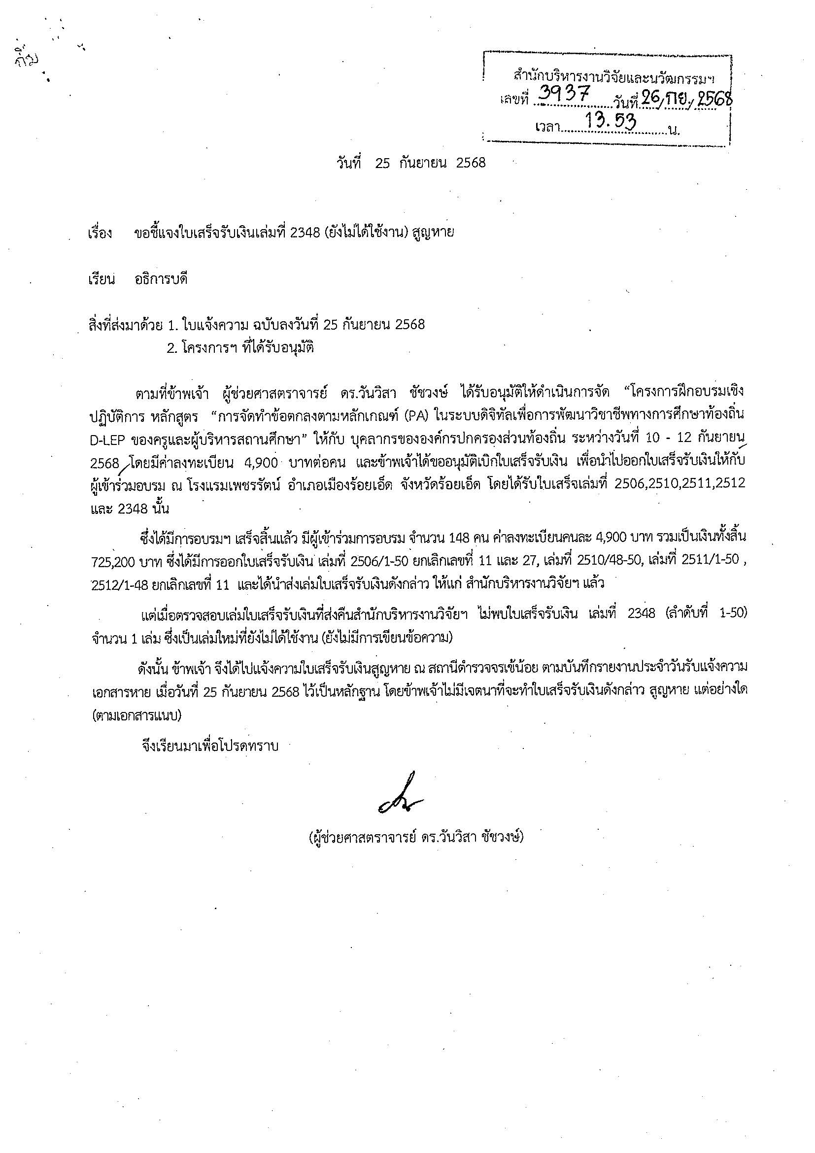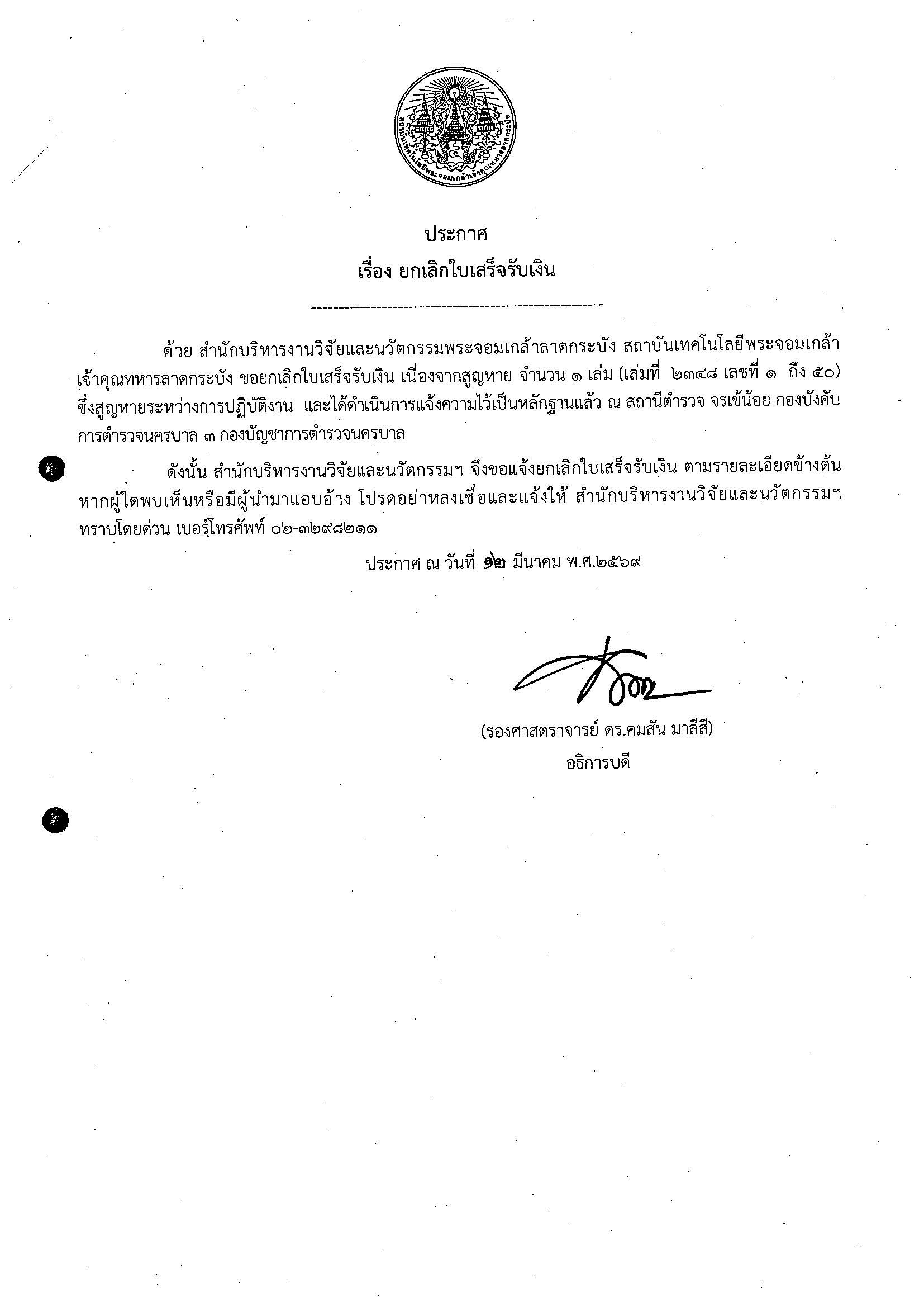 สถาบันเทคโนโลยีพระจอมเกล้าเจ้าคุณทหารลาดกระบัง ขอแจ้งยกเลิกใบเสร็จ เล่มที่ 2348 (ลำดับที่ 1 - 50 ) รายละเอียดตามเอกสารแนบ File attachment Document ยกเลิกใบเสร็จ.pdf News 5 views วันที่ Wed, 04/01/2026 - 11:23 จำนวนผู้เข้าชม 5 views Gallery Share this page