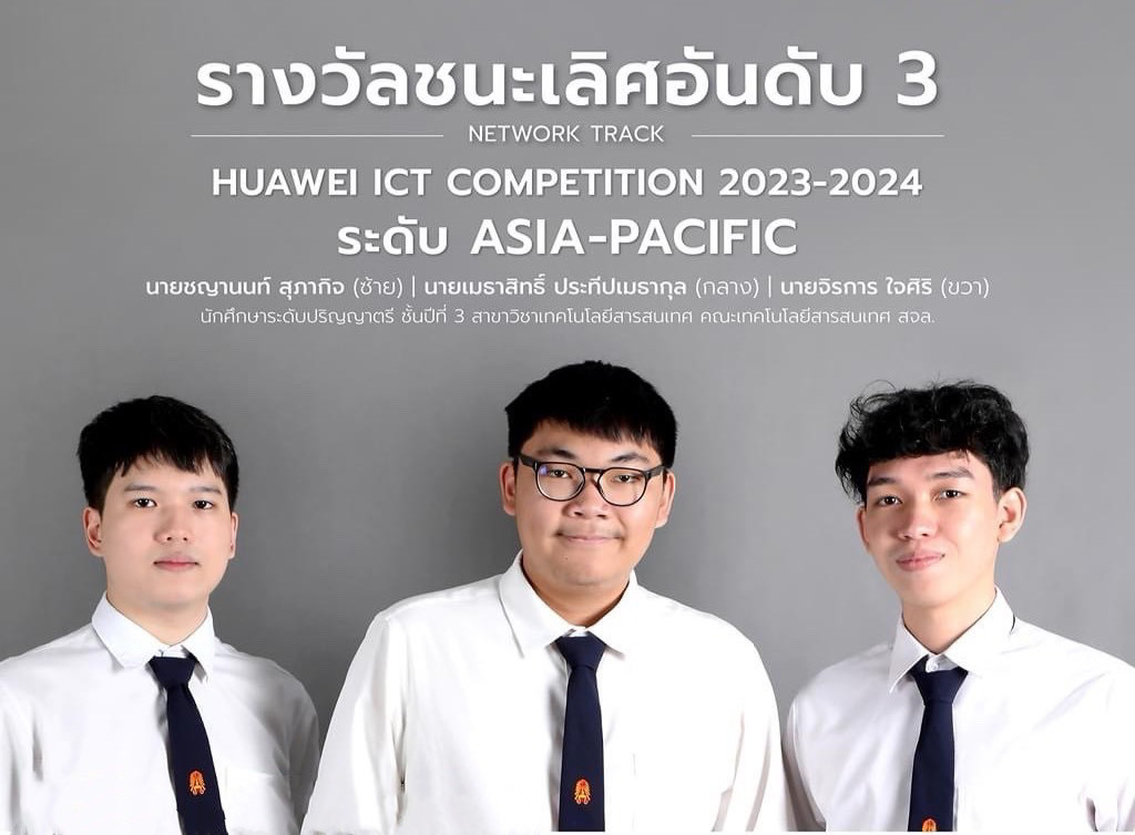 นักศึกษาระดับปริญญาตรี คณะเทคโนโลยีสารสนเทศ สถาบันเทคโนโลยีพระจอมเกล้าเจ้าคุณทหารลาดกระบัง คว้ารางวัลชนะเลิศอันดับที่ 3 จากการแข่งขัน Huawei ICT Competition 2023-2024 ระดับ Asia-Pacific ที่จัดขึ้นโดย บริษัท Huawei ร่วมกับ ASEAN Foundation เมื่อระหว่างวันที่ 17-19 เมษายน 2567 ณ อาคารสำนักเลขาธิการอาเซียน เมืองจาการ์ตา ประเทศอินโดนีเซีย โดยเป็นการแข่งกันที่มีนักศึกษาจากมหาวิทยาลัยเข้าร่วมเป็นจำนวนกว่า 12 ประเทศ ทั่วภูมิภาคเอเชียแปซิฟิก