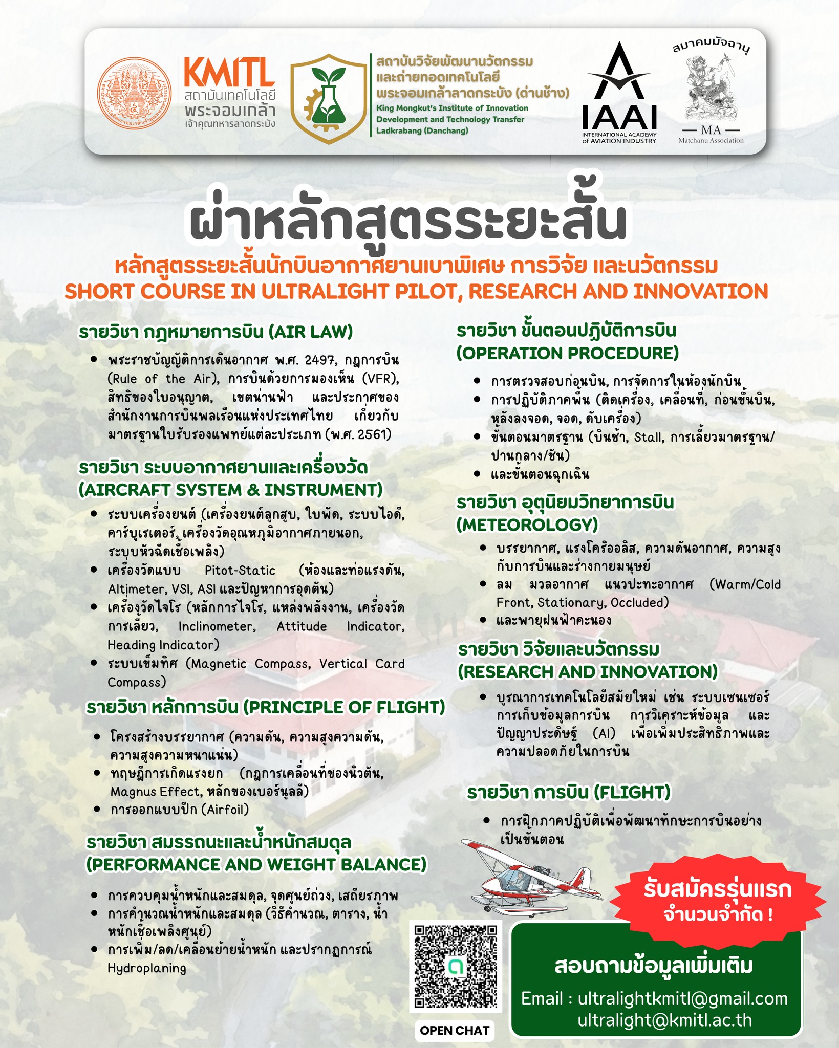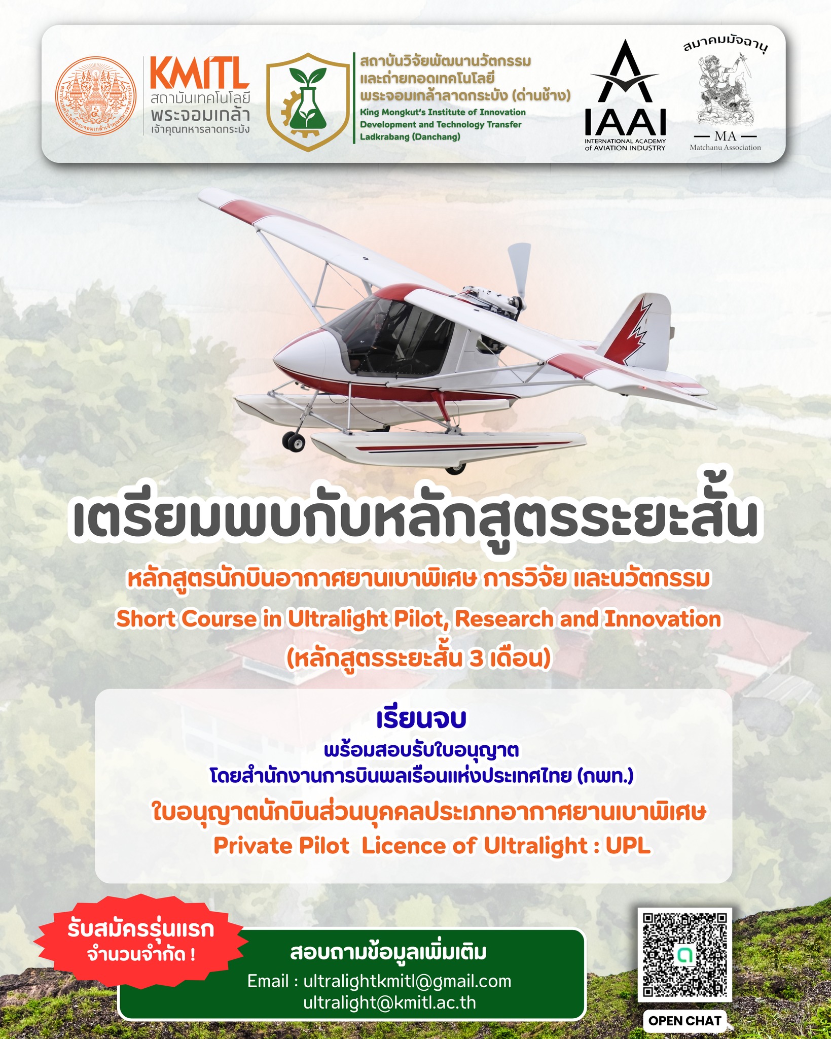 ผู้สนใจสามารถติดตามรายละเอียดเพิ่มเติมได้ทาง Facebook: ultralightkmitl หรือสอบถามผ่านอีเมล ultralightkmitl@gmail.com และ ultralight@kmitl.ac.th