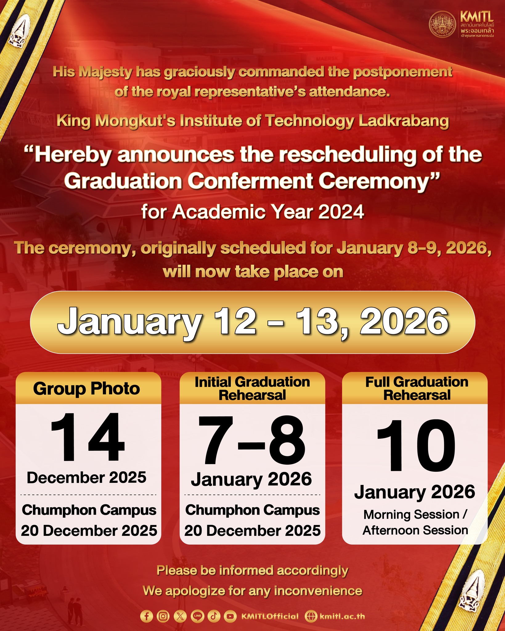 King Mongkut’s Institute of Technology Ladkrabang (KMITL) hereby announces the rescheduling of the Graduation Conferment Ceremony for the Academic Year 2024.