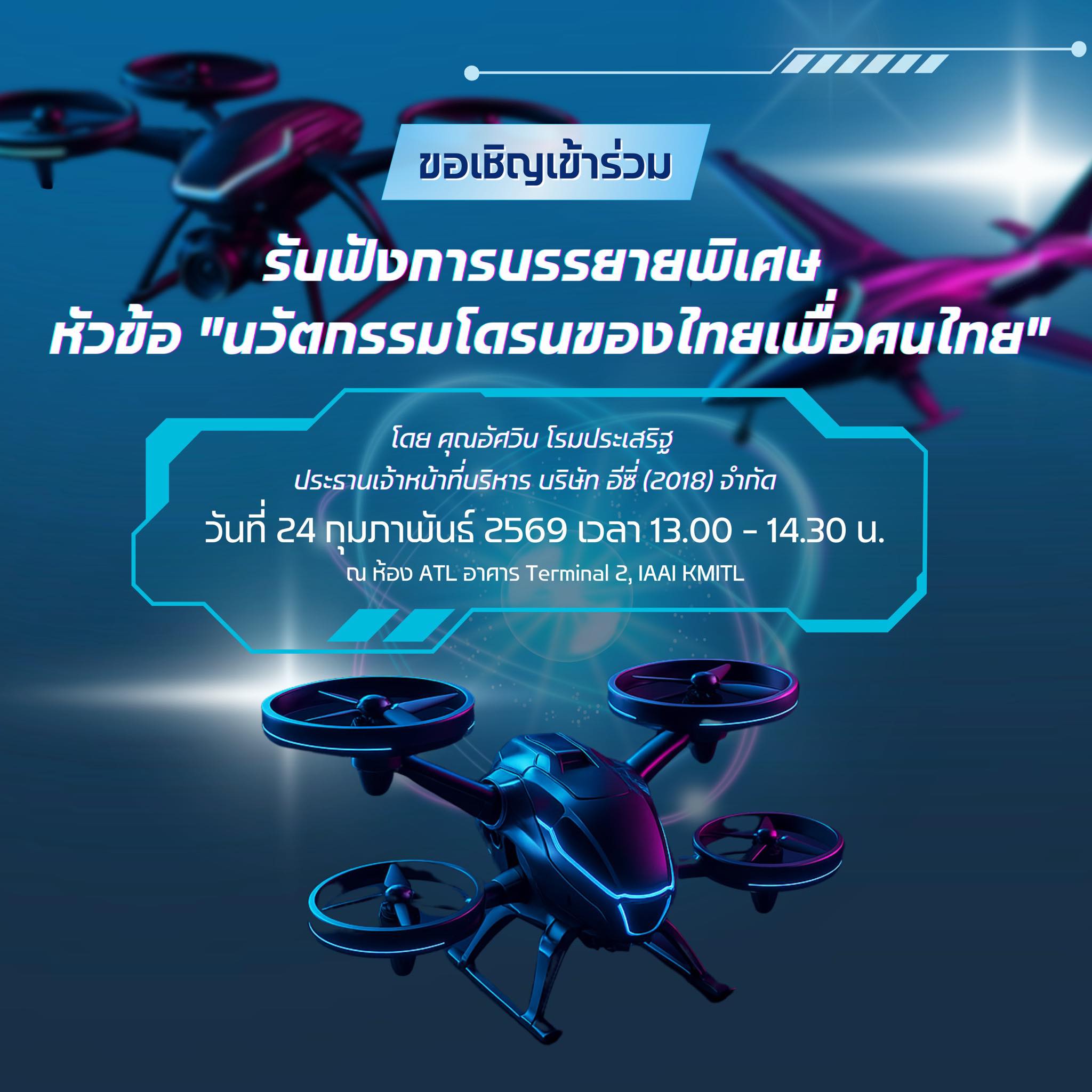 วิทยาลัยอุตสาหกรรมการบินนานาชาติ ขอเชิญผู้สนใจร่วมฟังการบรรยายพิเศษ เรื่อง "นวัตกรรมโดรนของไทยเพื่อคนไทย" ในวันที่ 24 กุมภาพันธ์ 2569 เวลา 13.00 - 14.30 น. ณ ห้อง ATL อาาคาร Terminal 2, IAAI KMITL วิทยาลัยอุตสาหกรรมการบินนานาชาติ เพื่อให้ผู้เข้าร่วมได้รับมุมมองจากผู้บริหารภาคอุตสาหกรรมโดยตรงทั้งในด้านทิศทางเทคโนโลยีการต่อยอดนวัตกรรมสู่การใช้งานจริง และการเตรียมความพร้อมกำลังคนสำหรับอุตสาหกรรมการบินในอนาคต ซึ่งจะเป็นคุณูปการต่อการพัฒนาการศึกษาและระบบนิเวศด้านนวัตกรรมของประเทศโดยรวม