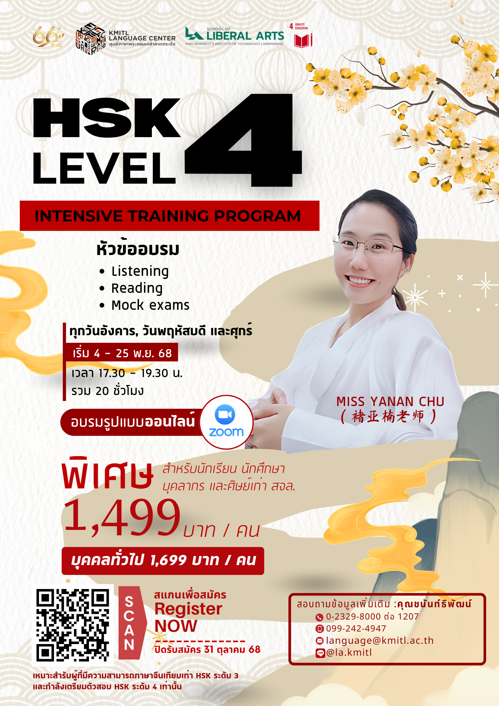 ศูนย์ภาษาพระจอมเกล้าลาดกระบัง คณะศิลปศาสตร์ สถาบันเทคโนโลยีพระจอมเกล้าเจ้าคุณทหารลาดกระบัง เปิดอบรมหลักสูตร “HSK-4 : Intensive Training Program รุ่นที่ 2” เพื่อเตรียมความพร้อมให้กับผู้เรียนในการสอบวัดระดับภาษาจีน (HSK) ระดับ 4 โดยมุ่งเน้นการพัฒนาทักษะสำคัญ ได้แก่ การฟัง (Listening) การอ่าน (Reading) และการฝึกทำข้อสอบจำลอง (Mock Exams)** เพื่อเพิ่มความมั่นใจในการสอบจริง กับอาจารย์ผู้เชี่ยวชาญชาวจีน