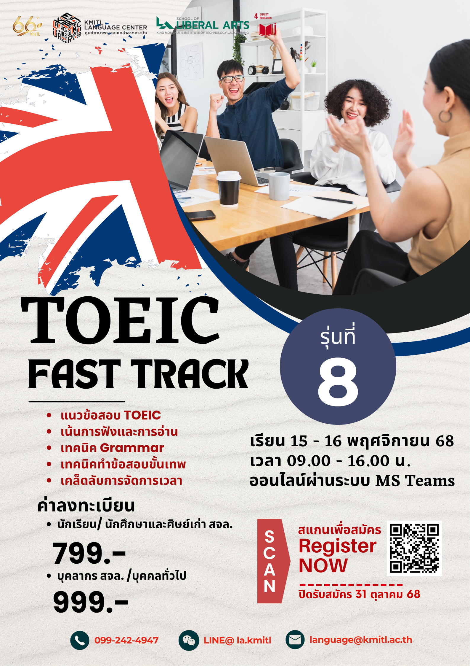 ศูนย์ภาษาพระจอมเกล้าลาดกระบัง คณะศิลปศาสตร์ สถาบันเทคโนโลยีพระจอมเกล้าเจ้าคุณทหารลาดกระบัง เปิดอบรมหลักสูตร “TOEIC Fast Track รุ่นที่ 8” เพื่อเตรียมความพร้อมให้แก่ผู้เรียนในการสอบวัดระดับความรู้ภาษาอังกฤษ (TOEIC) โดยเน้นการฝึกฝนทักษะการฟัง การอ่าน เทคนิคการทำข้อสอบ Grammar รวมถึงเคล็ดลับการบริหารเวลาและกลยุทธ์การตอบคำถามอย่างมีประสิทธิภาพ