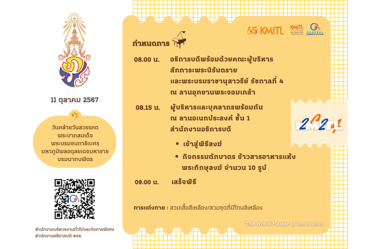 ขอเชิญทุกท่านร่วมพิธีทำบุญตักบาตรข้าวสารอาหารแห้ง พระภิกษุสงฆ์ จำนวน ๑๐ รูป เพื่อถวายเป็นพระราชกุศล แด่ พระบาทสมเด็จพระบรมชนกาธิเบศร มหาภูมิพลอดุลยเดชมหาราชบรมนาถบพิตร เนื่องในวันคล้ายวันสวรรคต (๑๓ ตุลาคม ๒๕๖๗) ในวันที่ ๑๑ ตุลาคม ๒๕๖๗ ณ ลานอเนกประสงค์ ชั้น ๑ สำนักงานอธิการบดี